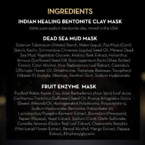 Purified Water, Kaolin Clay, Aloe Barbadensis (Aloe Vera) Leaf Juice, Carthamus Tinctorius (Safflower) Seed Oil, Prunus Amygdalus Dulcis (Sweet Almond) Oil, Hydrogenated Polydecene, Polyacrylate-13, Sodium Hyaluronate, Bentonite, Polysorbate 20, Lactobacillus/Pumpkin Ferment Extract, Bromelain (Pineapple), Papain (Papaya), Yeast Extract, Sodium C14-16 Olefin Sulfonate, Camellia Sinensis (Green Tea) Leaf Extract, Chamomilla Recutita (Matricaria) Flower Extract, Benzyl Alcohol, Mango Extract, Papaya Extract, Ethylhexylglycerin.