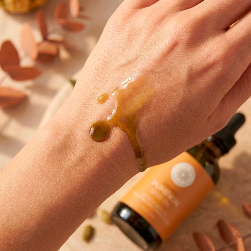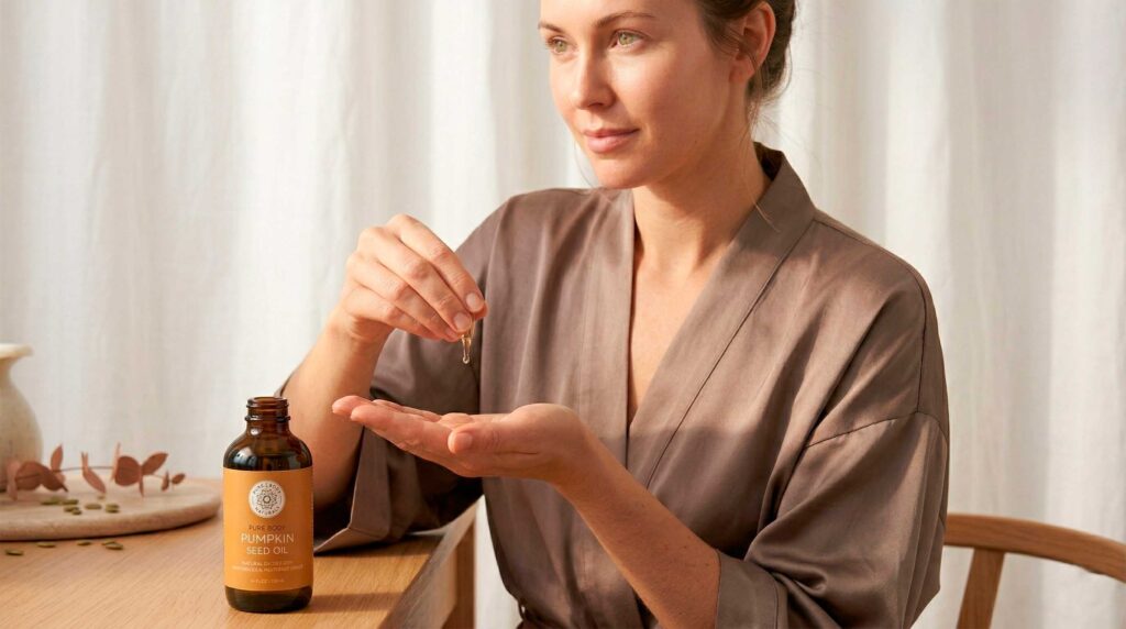 Using pumpkin seed oil as a facial oil is straightforward, but a few practical details make a real difference. Apply it to clean, dry skin rather than damp skin. Two to three drops is usually sufficient for the full face. Press and massage the oil in gently rather than rubbing — pressing encourages the oil to absorb into the skin rather than sitting on top of it. The texture is slightly heavier than light oils like fractionated coconut or grapeseed, so it works particularly well as a final step in an evening routine or as a dedicated treatment on especially dry days.